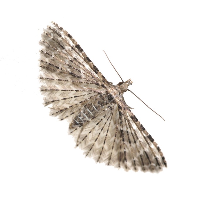 This is a member of a rather large group of moths that fly using rackets, not paddles. The “plumes” of the plume moths are remarkably similar to feathers on a bird. Learn more about how these remarkable organisms are capable of flying here.