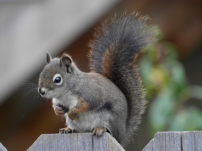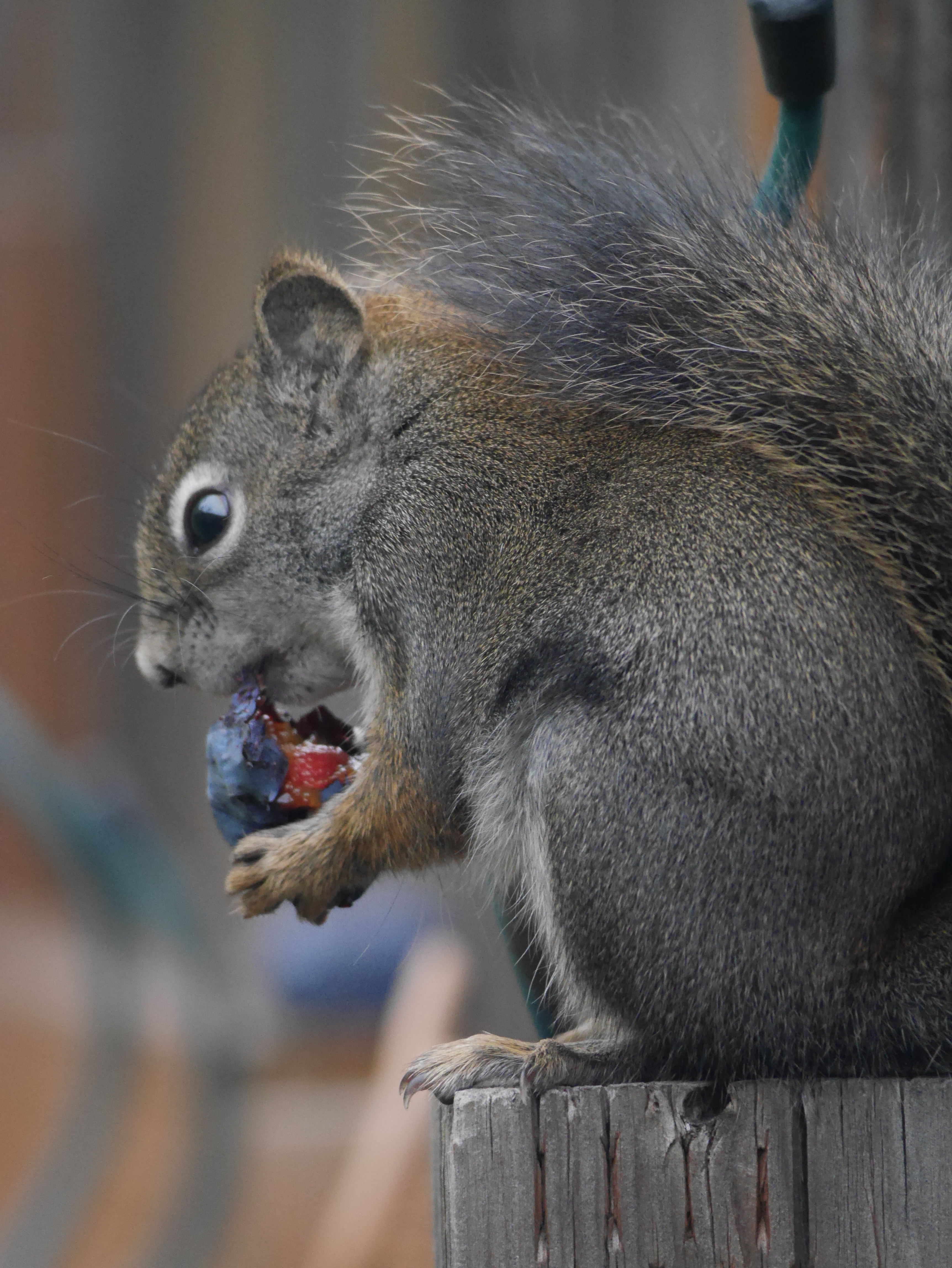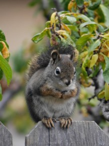 Red Squirrels are rarely found in town here in Missoula. They require an ample supply of pine cones unlike their more adaptive relatives, the Eastern Fox Squirrel and the Eastern Gray Squirrel. But in neighborhoods adjacent to our nearby open spaces, these critters can adapt to live alongside people. This little guy was busy munching on an overripe plum when I interrupted him for a photo.