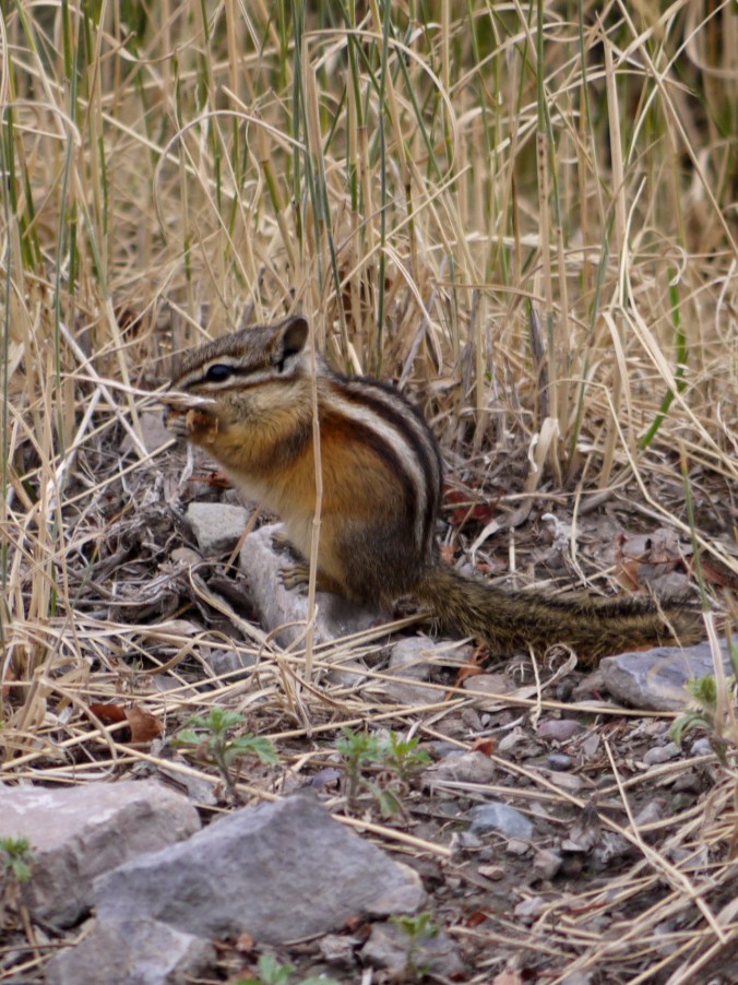 Chipmunks can be hard to identify from afar, so knowing what habitat types certain species prefer can really narrow-down your options. Here in western Montana, three species regularly co-occur (Red-tailed, Yellow-pine, and Least). Red-tailed Chipmunks tend to prefer moist coniferous forests like those in Glacier National Park, while Yellow-pine Chipmunks tend to prefer drier, Ponderosa/Doug-Fir forest edges. Least Chipmunks are found everywhere in between including alpine, sagebrush, coniferous forests, and meadows.